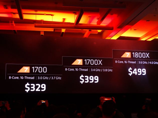 - Ryzen 7 1800X: o flagship da linha com oito núcleos, 16 threads e terá clock base de 3.6 GHz, com boost para 4.0 GHz. Chegará ao mercado por US$ 499 (ou cerca de R$ 1.545 na cotação atual, desconsiderando impostos)